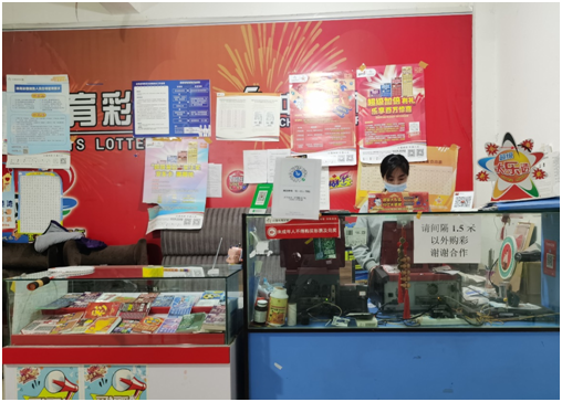 走进店内,墙上张贴的责任彩票宣传栏、公益金宣传栏、以及竞彩、顶呱刮和超级大乐透的中奖宣传栏应有尽有。“禁止吸烟”“未成年人不得购买彩票及兑奖”“快乐购彩,理性投注”等标语一应俱全。